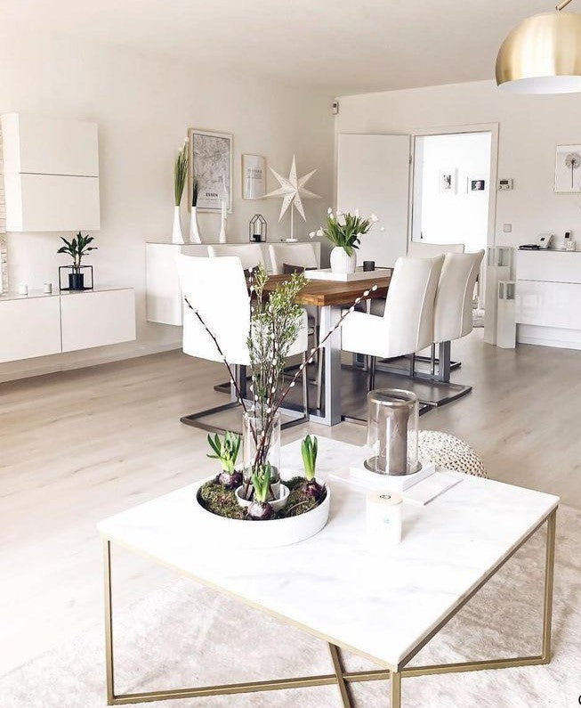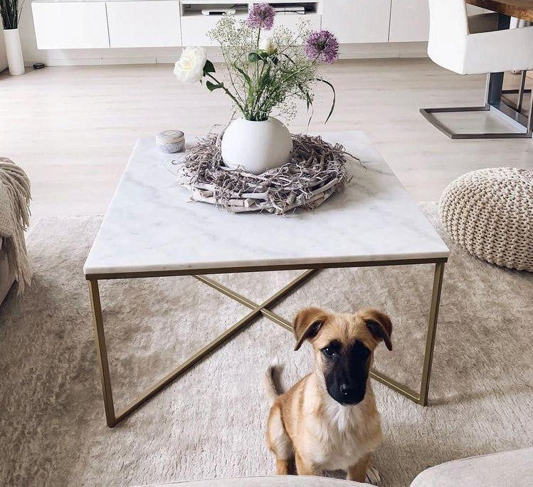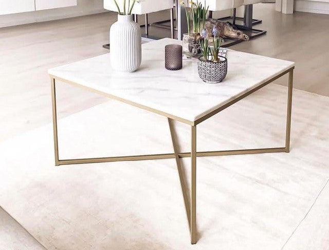 MATERIALES: CUBIERTA DE MÁRMOL CARRARA NATURAL Y BASE DE ACERO EN COLOR ORO